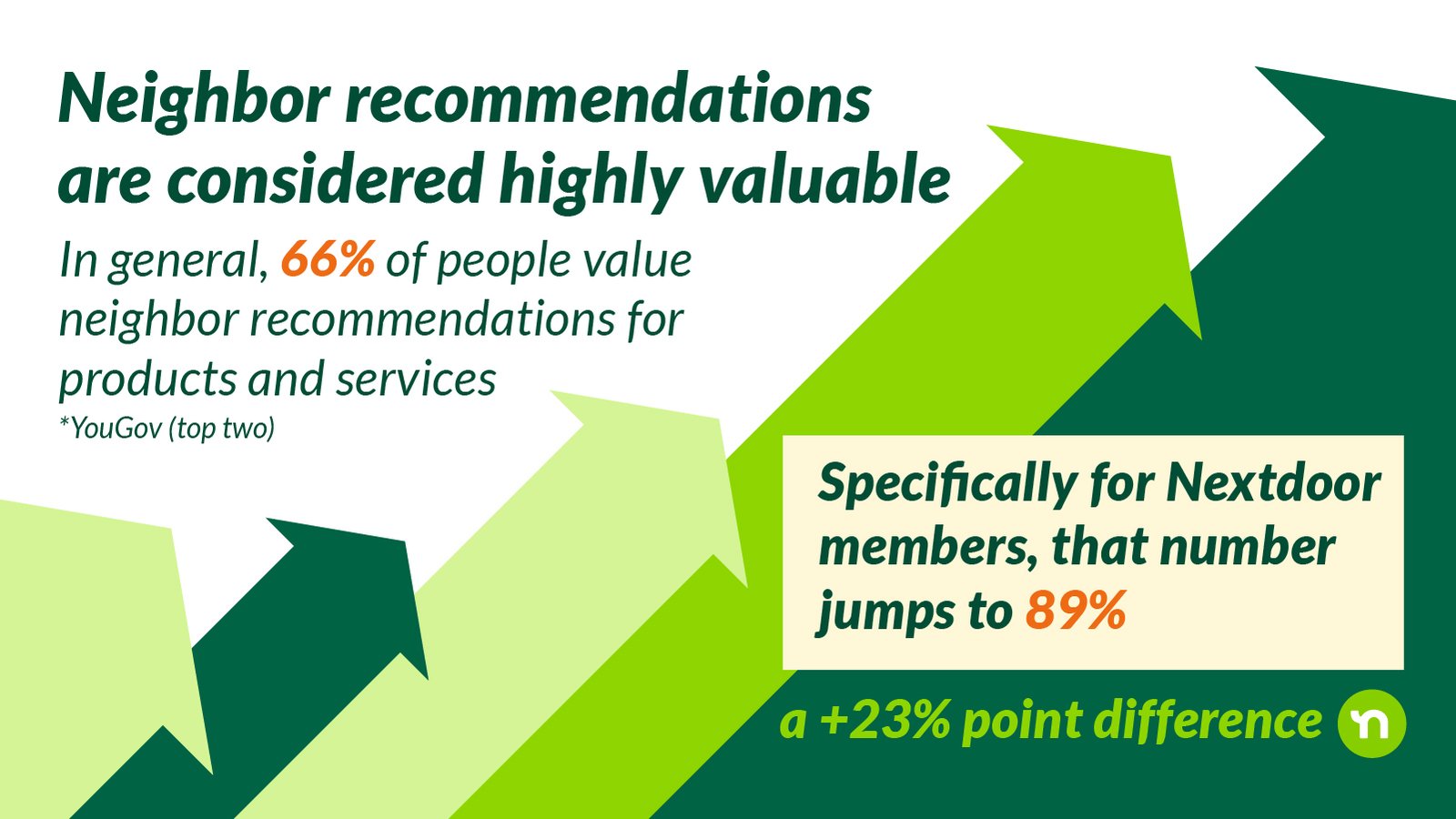 While generally, 66% of people value neighbor recommendations for products and services, on Nextdoor, that percentage jumps to 89%.